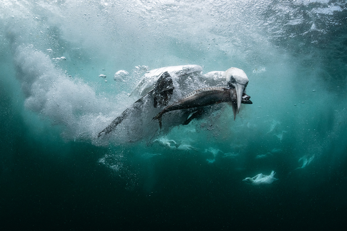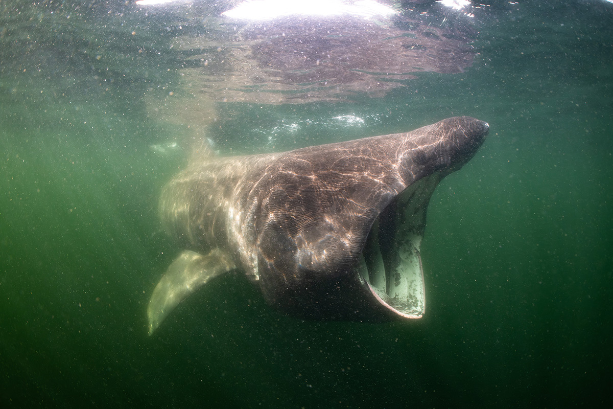 De reuzenhaai is één van mijn favoriete Noordzee dieren! Ik heb jaren geprobeerd om deze gigant voor de lens te krijgen. Van Ierland, Engeland tot de westkust van Schotland. Dat het uiteindelijk in de Noordzee mocht slagen was echt een droom die uitkwam. Het is niet te beschrijven wat er na al die pogingen door je heen gaat als er meerdere reuzenhaaien met hun enorme opengesperde bekken op je af komen zwemmen. Ik was in extase! Het fotograferen van de haaien was technisch gezien niet complex aangezien ik natuurlijk licht gebruikte. Uiteraard was het idee om het foerageren van de haaien vast te leggen, maar ik wilde ook graag gebruikmaken van mijn freedive vaardigheden. Je bent daardoor meer flexibel in de hoeken die je kan maken in je compositie. Het was echt tof om onder de haaien door te duiken om hun silhouetten vast te leggen. Er zwom ook nog een school makreel onder die óók op het plankton aan het jagen was! Verder was ik vooral op zoek naar de juiste lichtval op de haaien en het juiste moment van afdrukken tussen de wolken plankton door.